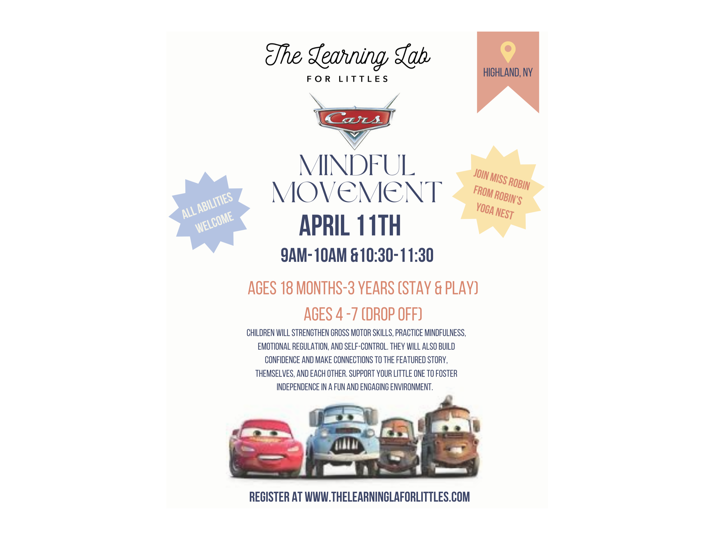 The Learning Lab for Littles presents Mindful Movement Stay & Play, a class that integrates high quality literature and kinesthetic learning.Children will strengthen gross motor skills, practice mindfulness, emotional regulation, and self-control. They will also build confidence and make connections to the featured story, themselves, and each other. Support your little one to foster independence in a fun and engaging environment.