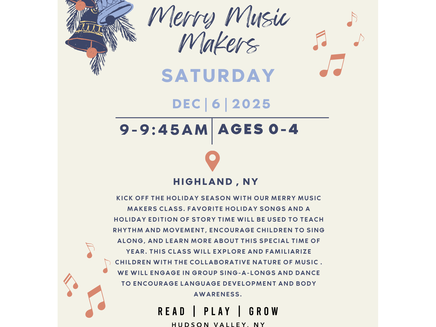 Kick off the holiday season with our Merry Music Makers class. Favorite holiday songs and a holiday edition of story time will be used to teach rhythm and movement, encourage children to sing along, and learn more about this special time of year. This class will explore and familiarize children with the collaborative nature of music .
